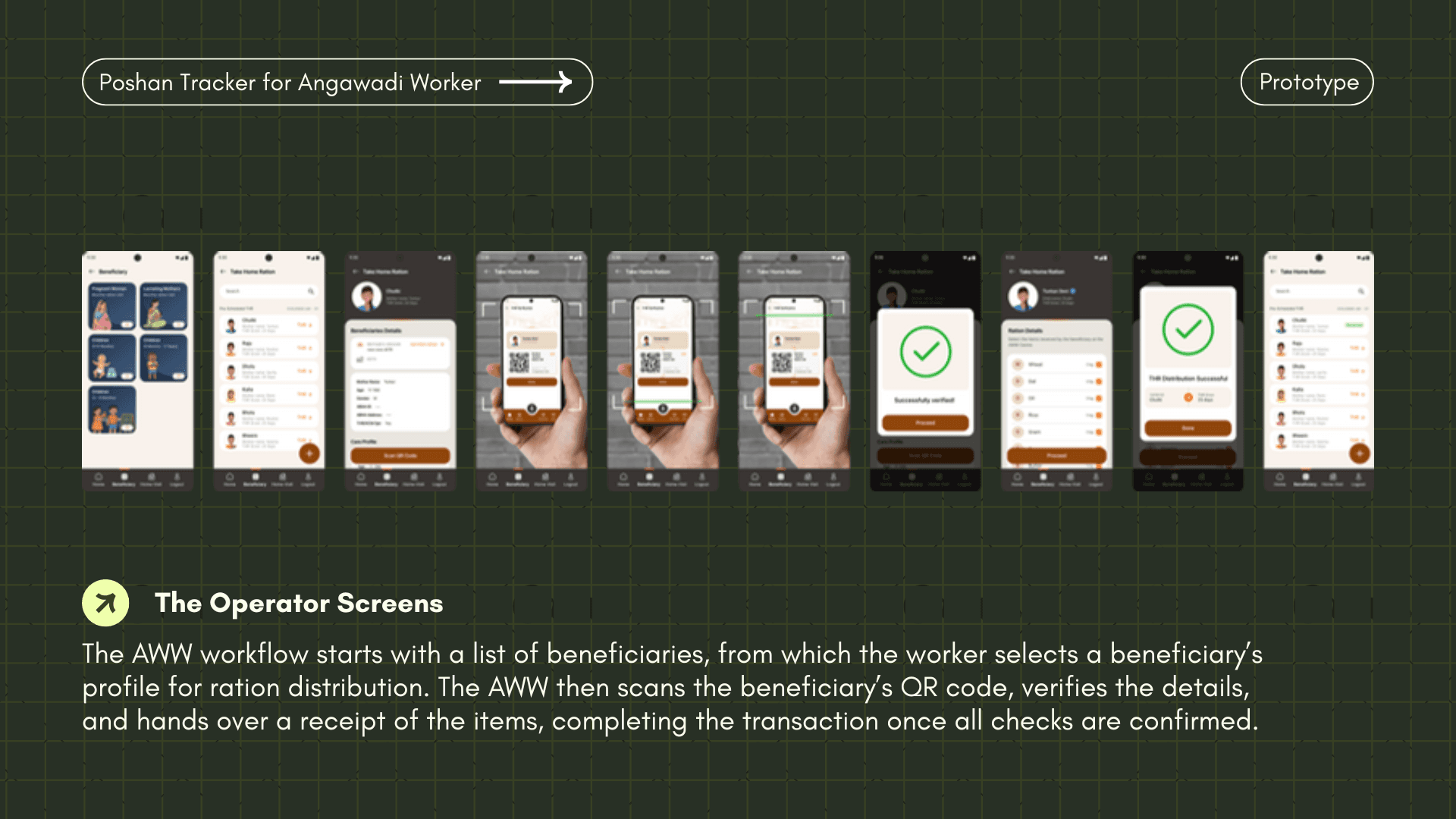 We designed a simpler and better alternative of current poshan tracker utilizing conversational AI for ration distribution via QR codes, collaborating with 17 Anganwadi workers. The solution improves nutrition accessibility for beneficiaries and streamlines the transaction process for field workers.
