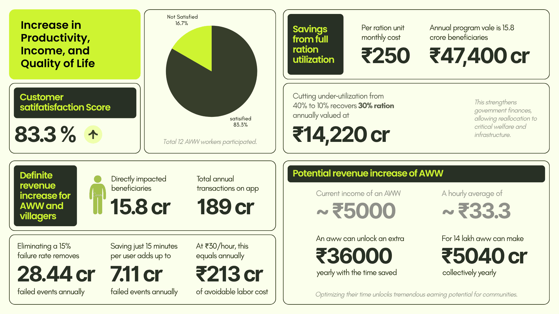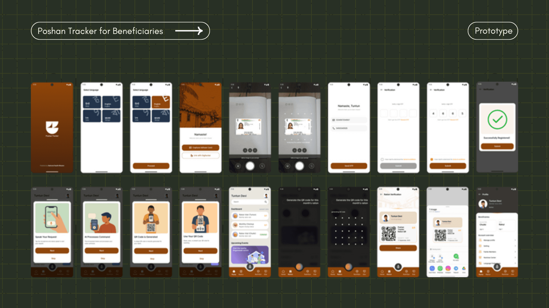 My primary involvement included leading primary research with 17 Anganwadi workers, creating the core solution framework and user flows for both beneficiaries and AWWs, conducting user testing on the prototypes, and defining the success metrics (projected impact on 8.8M+ beneficiaries)