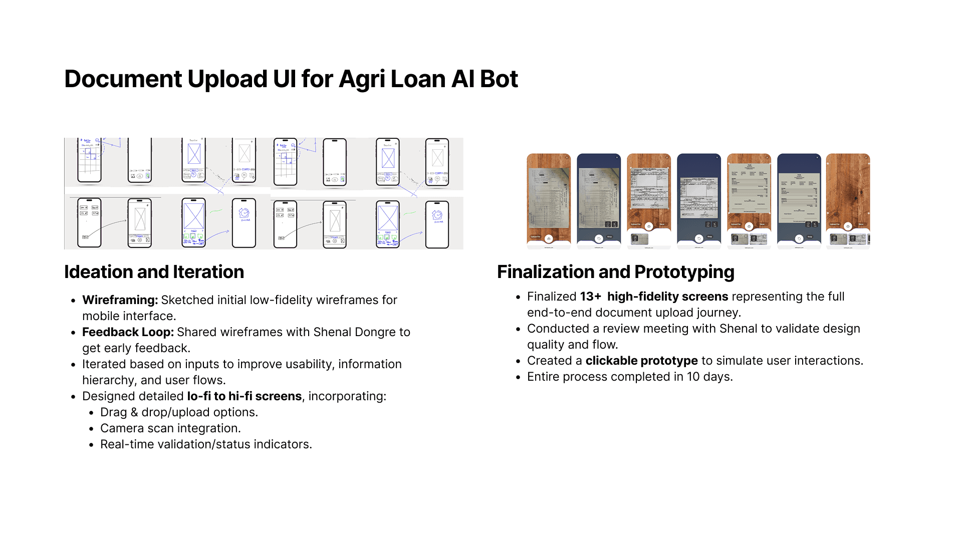 Project 2: Fulfilled live projects (Agri AI Loans, SmartVyaapar, POS benchmarking), performing heuristic evaluations on 25+ screens, validating with 20+ users, and delivering designs projected to cut Agri loan drop-offs 30%, double rural adoption, and reduce rework 20%.