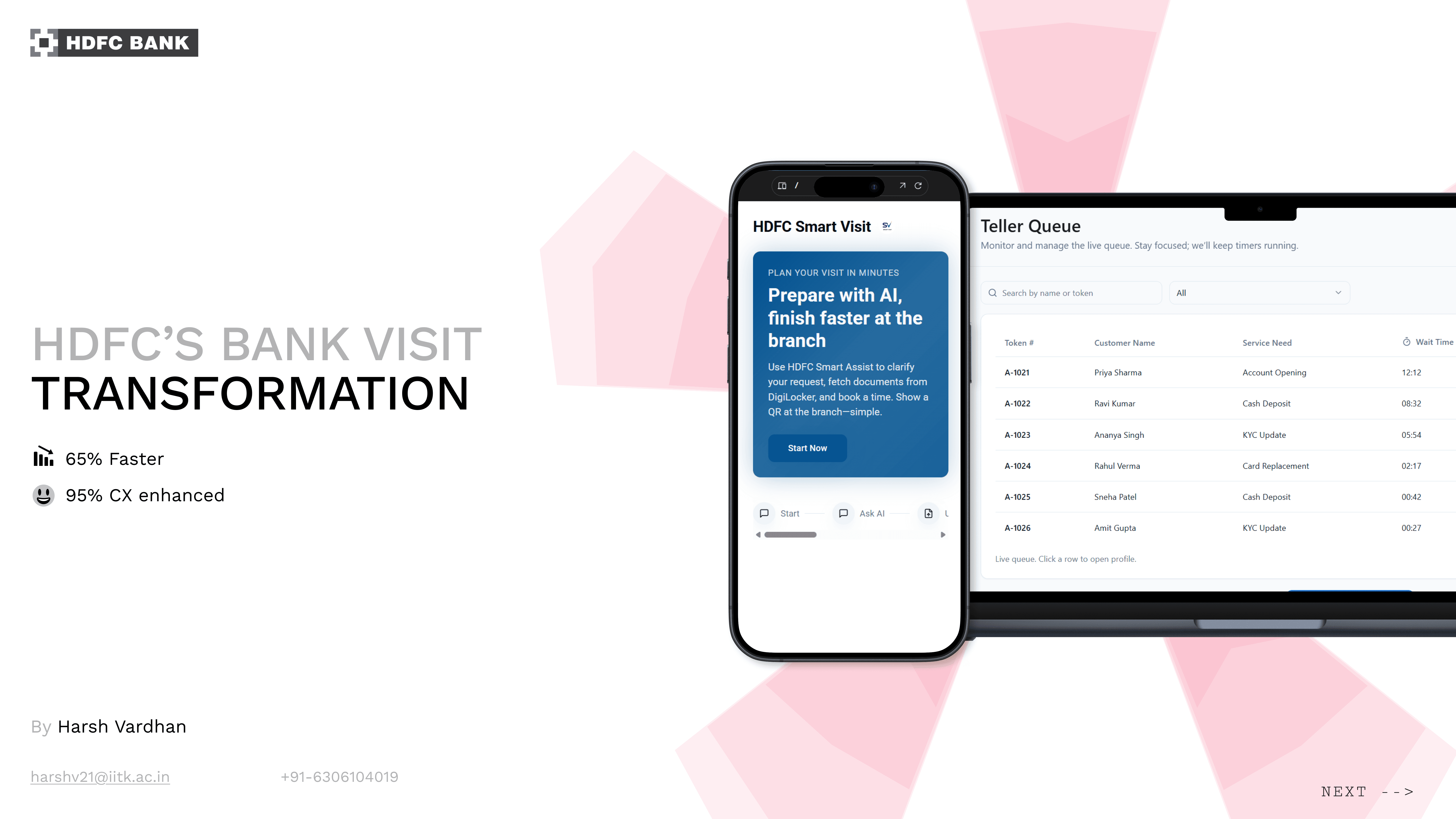 Project 1: Crafted AI-powered features with research, personas, and 35+ hi-fi prototypes, streamlining branch visits, documentation, query resolution, and appointment scheduling, validated with 15+ users to cut task time 50% and raise CSAT 90%